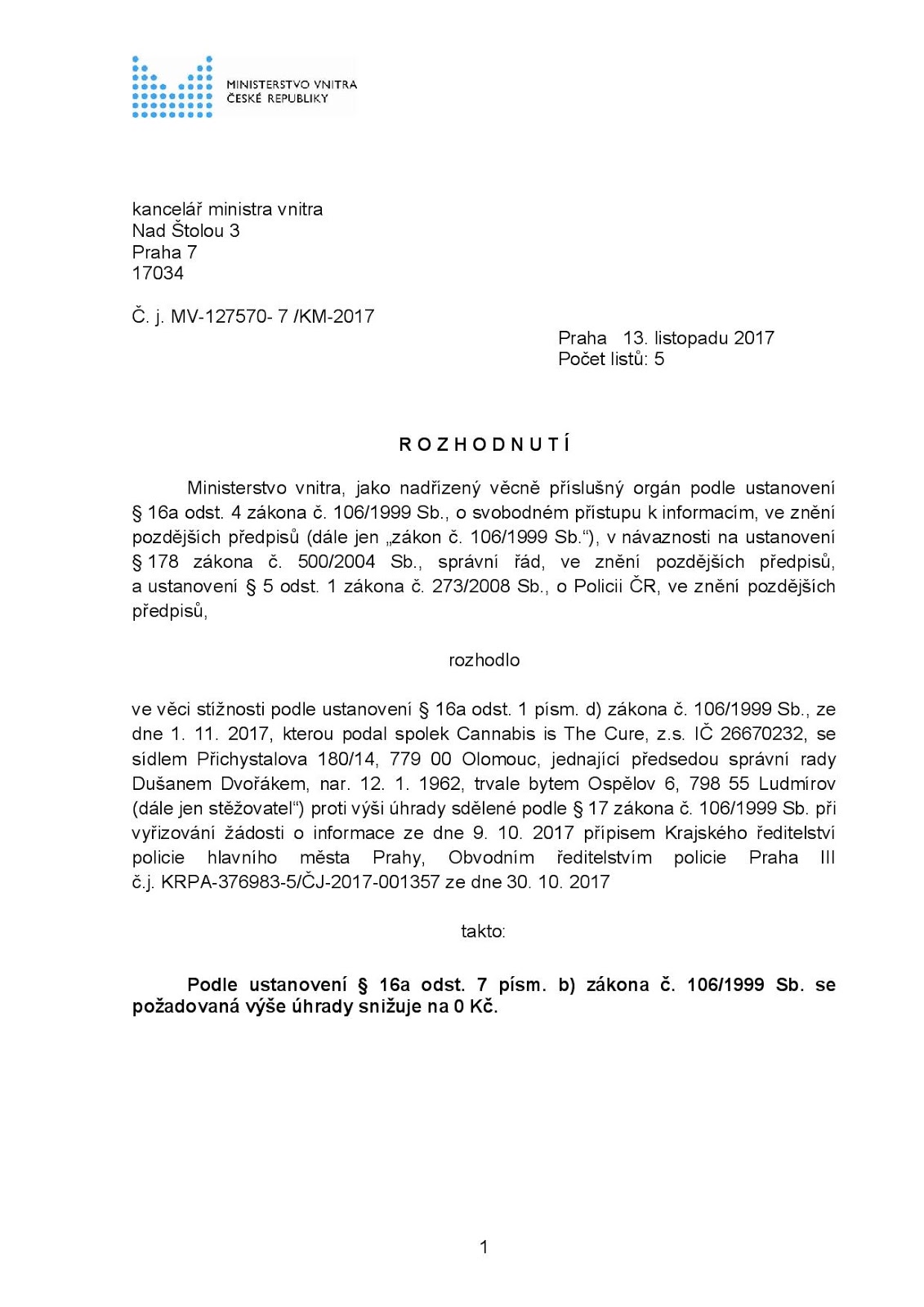 Ministerstvo vnitra dne 13.11.2017 pod č.j. MV-12750-7/KM-2017 rozhodlo o nulové výši úhrad za vydání informací Policií ČR k žádosti o informace asociace Cannabis is The Cure,z.s. ze dne 9.10.2017